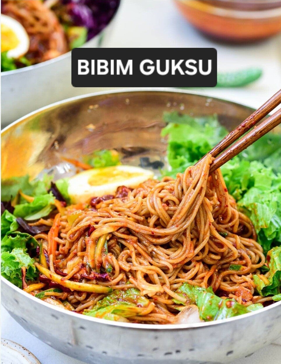 Somyeon (thin wheat noodles) is usually used for BIBIM GUKSU (spicy cold noodles), but you can use soba noodles or naengmyeon noodles which are a mix of buckwheat and potato starch. Naengmyeon noodles are VERY chewy. Somyeon noodles are also used to make JANCHI GUKSU, a warm noodles soup.